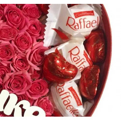 Нежная и сладкая коробочка для самого дорогого человека Мамы! Отлично подойдет на день рождения, 8 марта, день матери , ида и по любому поводу. Внутри- красивые кустовые розы и вкусные и нежнейшие конфеты рафаэлло и любимов. Композиция собрана нашим флористом в специальной флористической губке, пропитанной водой.