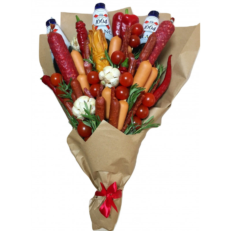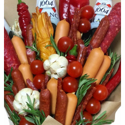 Состав: пиво Blanc (3 шт.), сыр косичка, колбаски салями, вареные сосиски, колбаски кабаноси, охотничьи колбаски, болгарский перец, чеснок, помидоры черри, перец чили, розмарин, декор.