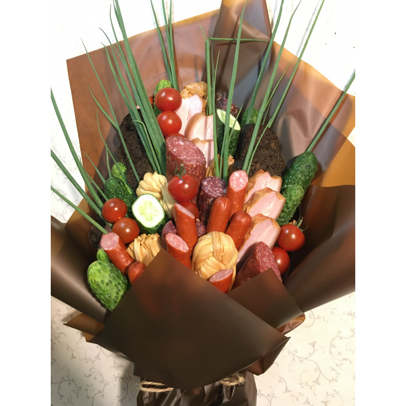 Склад: копчені ковбаски, ковбаса, буженина, огірки, помідори черрі, зелена цибуля, сир косичка, хліб, часник, декор.