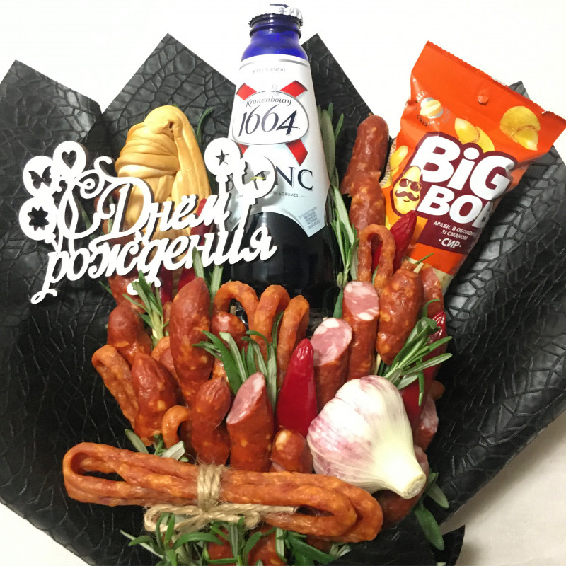 Склад: пиво, сир косичка, ковбаски, арахіс, зелень, часник, декор