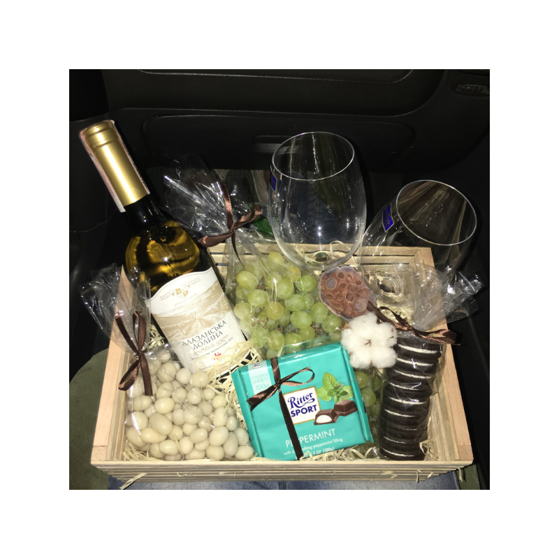 Склад: біле напівсолодке вино, два келихи для вина, шоколад Ritter sport, печиво Оreo, гроно винограду, арахіс в білій глазурі, декор.