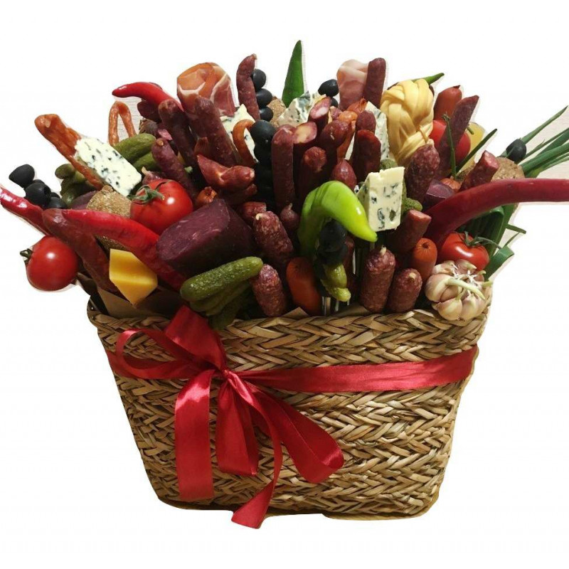 Подарункова корзина з різноманітністю м'ясних делікатесів, сирів і овочів. Такий кошик може стати відмінним подарунком як для чоловіка так і для жінки. В кошик можна додати улюблений напій або продукт. Красивий, стильний кошик прикрашений атласною стричкою, що надає їй розкішний вигляд.